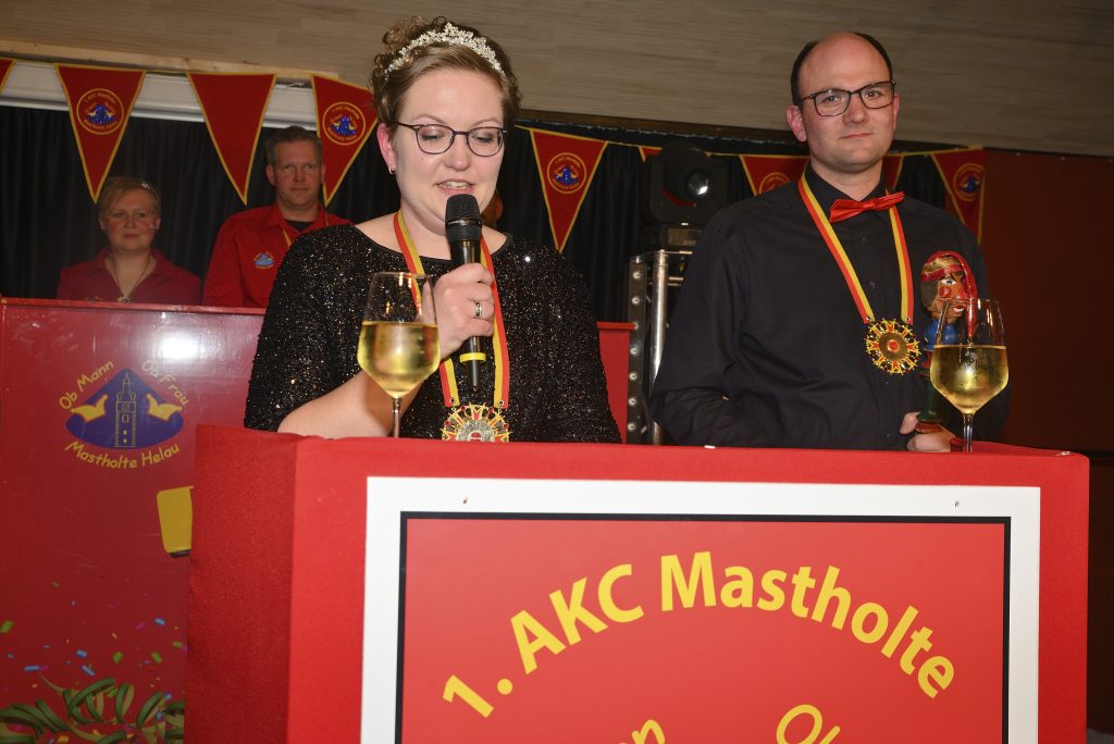 Dann war es soweit: Unter den Klängen des „schmucken Prinzen“ zog das neue Prinzenpaar ein. Große Überraschung und strahlende Gesichter im Saal begleiteten die Proklamation von Markus und Julia Brunsing als neue Majestäten des AKC Mastholte.